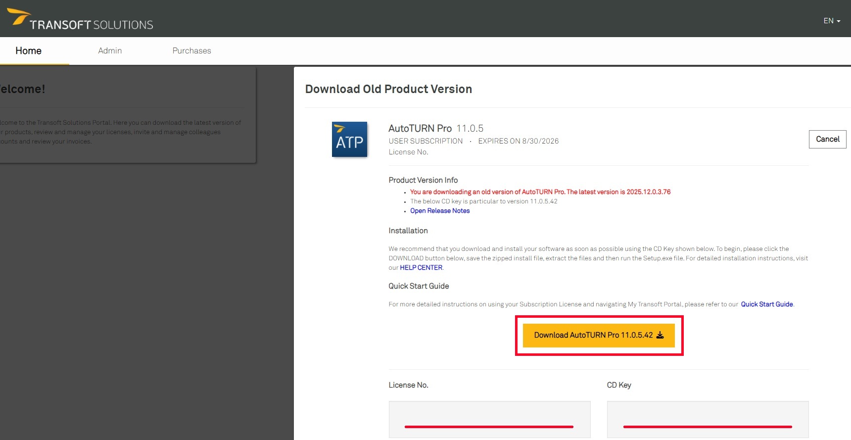 Den Download-Link sowie den CD-Key für ältere Versionen, beispielsweise AutoTURN, finden Sie im My Transoft Portal unter Home → Produkte herunterladen (Download Products). Klicken Sie bei der entsprechenden Lizenz auf Download und wählen Sie anschließend Ältere Versionen herunterladen (Download Older Versions) aus.