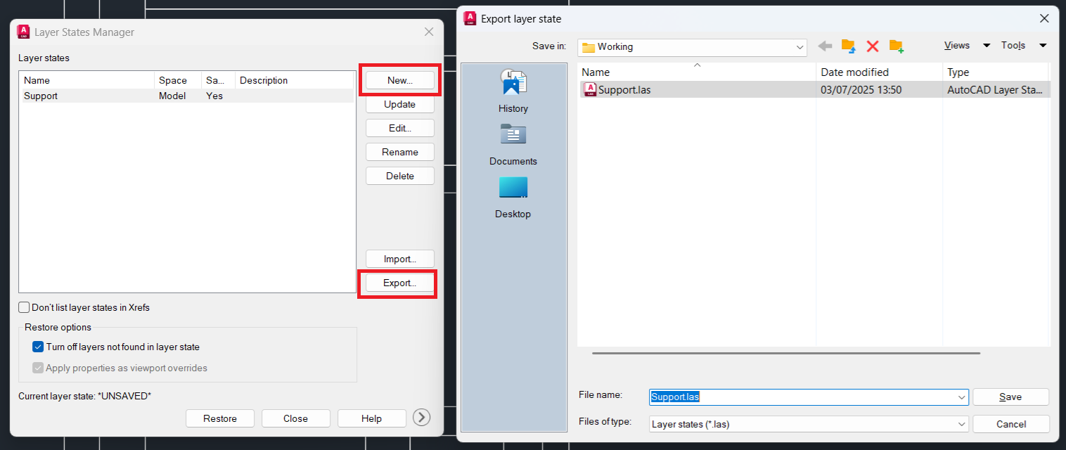 - Click [Save] and [Export] saving the new layer state settings as a *.LAS file. Close the Layer States Manager.