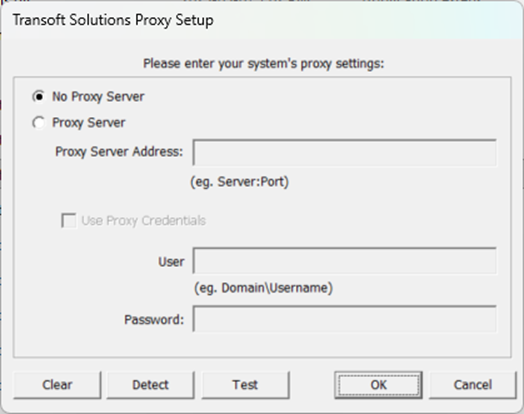 For subscription licenses (USL/TSL) if the software cannot contact the My Transoft Portal it will automatically try to detect proxy settings from the system, and if that doesn’t work, it will prompt the end user to manually configure the proxy settings.