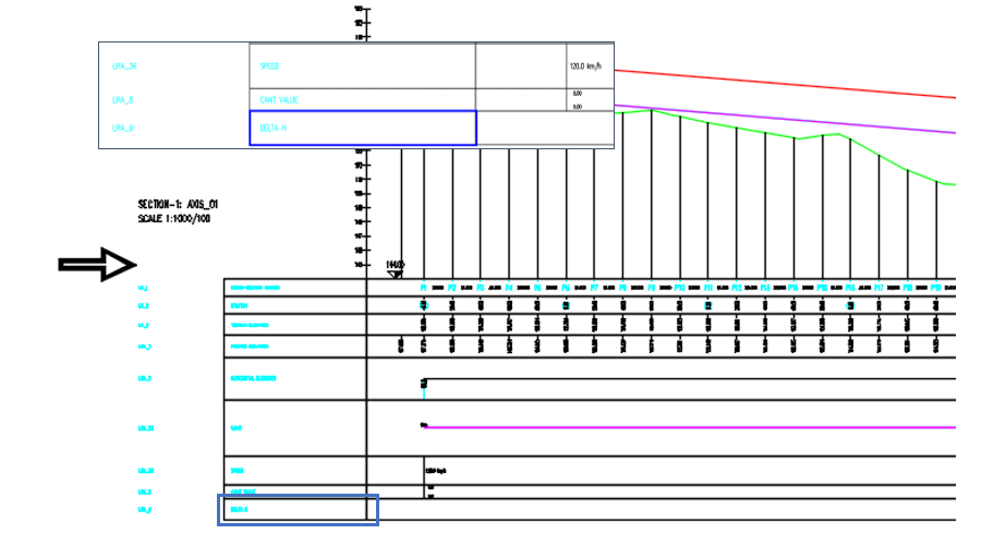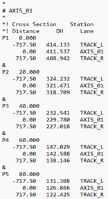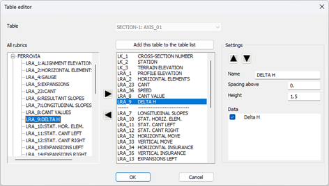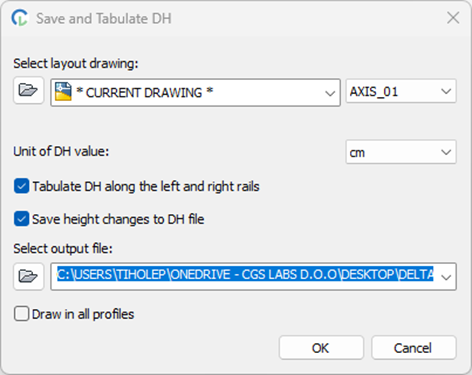 - Check the option “Tabulate DH along the left and right rails” if you want to enable the calculation and tabulation of the elevation difference between the terrain and the left and right rails. Without this option, only the elevation difference between the centerline and the terrain line is tabulated.