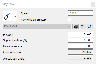 While giving route details the ˝EasyDrive˝ dialog box appears, where you define the speed, friction, superelevation of the road, and the minimum possible radius that can be driven with the vehicle at the selected speed, friction, and superelevation of the road.