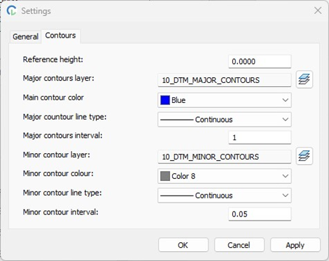 5. In this dialogue box, you can change the colour and layer of contours. At the same time, you can also specify the major and minor intervals. In our case, we want the contour lines to be drawn more densely, so we decrease this interval.