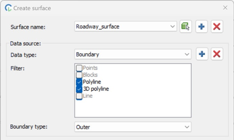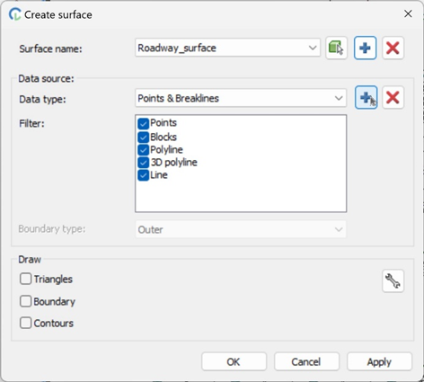 3. Select "Points and breaklines" from the drop-down menu and click the plus button. Then, select all the 3D road edges that represent the roadway edges.