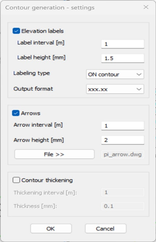 3. After that, a new dialog box opens where you specify the elevation interval and the drawing contour method. If you want arrows indicating the slope to be drawn, click the Settings button and check the box next to the arrows option. Specify the arrow interval and height, then click OK.
