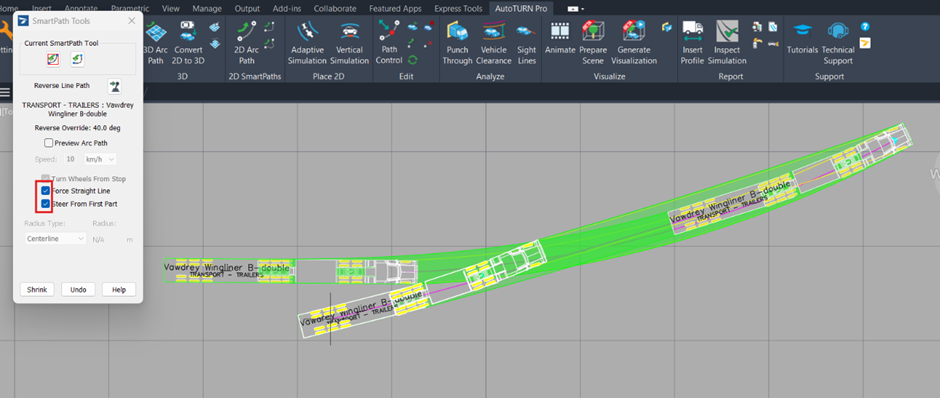 - Avoid switching the trailer's travel direction. If the vehicle and trailer are aligned with the desired end position, the Force Straight Line tool can help minimize sections and steering changes for one- and two-part vehicles. This option can be enabled in the setting shown below.