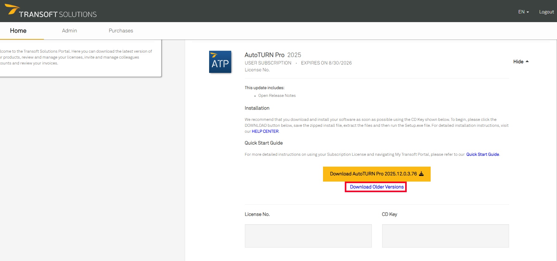 U kunt de downloadlink en CD-key voor oudere versies van software (zoals AutoTURN) vinden in de My Transoft Portal, onder Home -> Download Products. Klik op Download bij de betreffende licentie en selecteer vervolgens Download Older Versions.